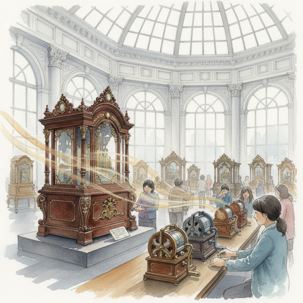 2階に上がると、さらに多くの珍しいオルゴールとの出会いが待っていました。ここでは、様々な時代や地域で作られたオルゴールが、それぞれの物語と共に展示されています。中でも印象的だったのは、小さな木製の箱型オルゴール。100年以上の時を経た今でも、驚くほど澄んだ音色を奏でています。