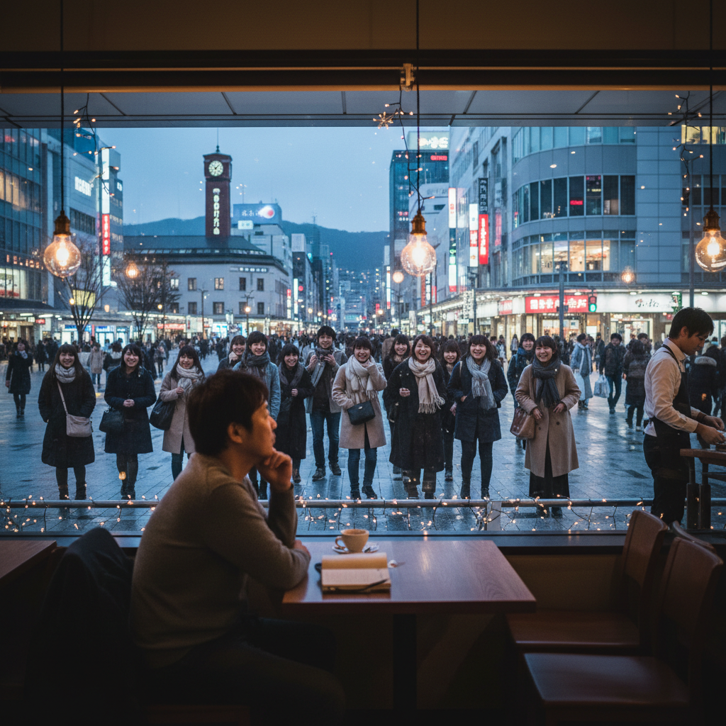 十一月の終わり、夕暮れから夜へと移り変わる時間帯の三宮は、いつもとは違う空気に包まれていた。駅前のロータリーには人の流れが絶えず、ビルの窓から漏れる明かりが歩道を照らしている。私はカフェ「コルトレーン」の窓際に座り、温かいミルクティーを手に持ちながら、ガラス越しにその光景を眺めていた。