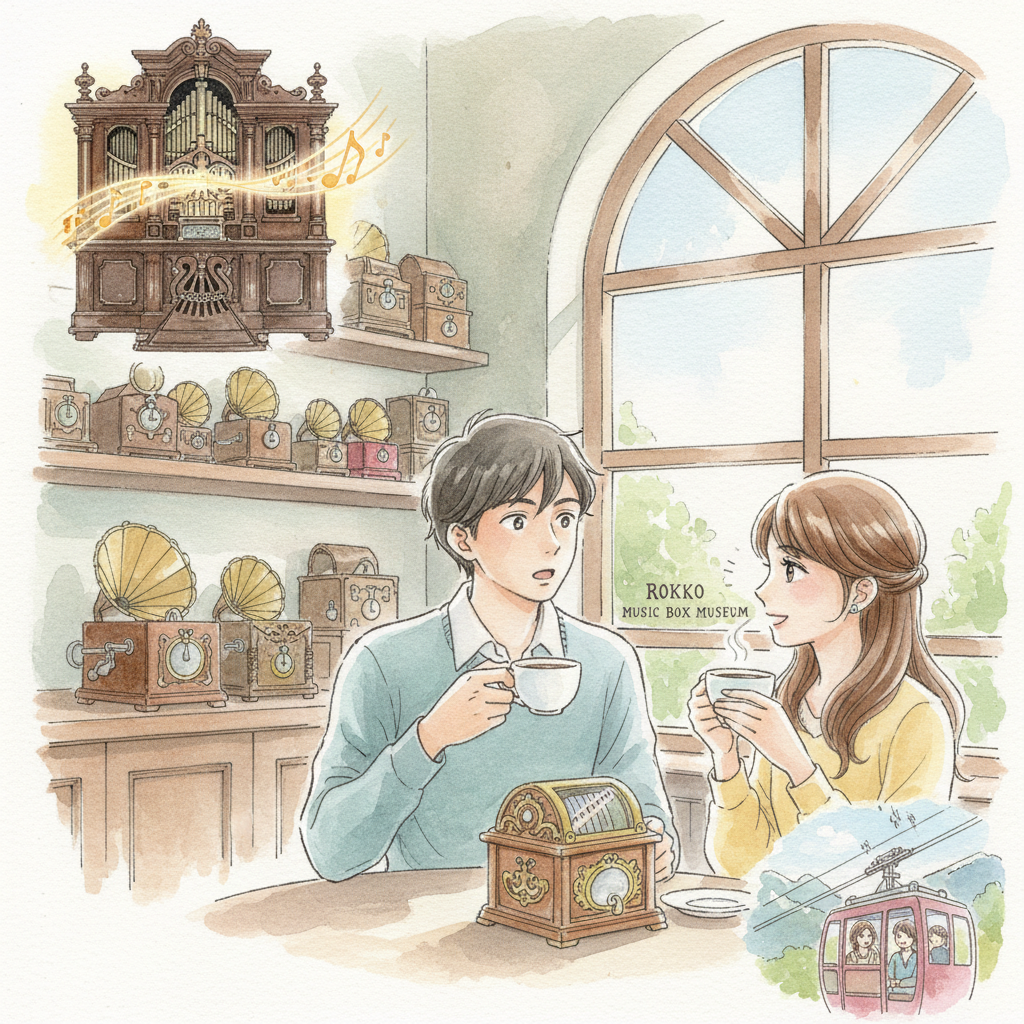 館内にある小さなカフェで、私たちはコーヒーを頼んだ。窓際の席に座ると、六甲山の緑が目の前に広がっている。神戸の街は霞んで見えなかったけど、それもまた良かった。コーヒーを飲みながら、さっき聴いたオルゴールの話をした。彼女は「あの大きいやつ、家に欲しいね」なんて冗談を言っていたけど、本気で欲しそうな顔をしていた。ミュージアムショップで売っている小さなオルゴールを買おうか迷ったけど、結局買わなかった。買わない方が、この日のことを特別に覚えていられる気がしたから。