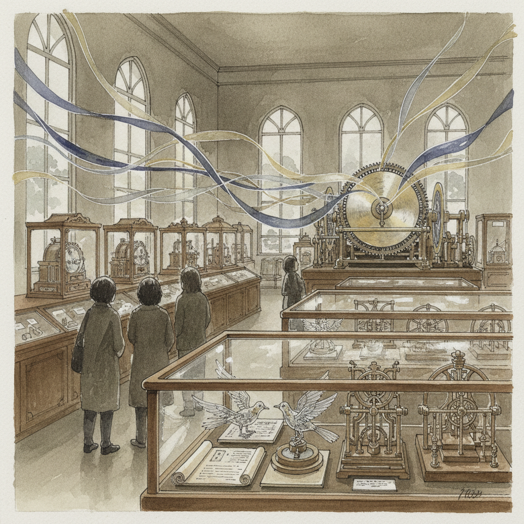 展示ケースの中には、19世紀のスイス製オルゴールとか、鳥が動くオートマタとか、見たこともないような精巧な機械がずらりと並んでいる。説明書きを読むと、どれも貴族や富裕層のために作られた一点物らしい。ひとつひとつに職人の名前が刻まれていて、中には「ブレモン社」とか「ポリフォン」とか、聞いたこともないブランド名が書かれている。彼女が「これ、すごいね」と指差したのは、小さな鳥が本物みたいに羽ばたくオートマタだった。ガラス越しに見ても、羽の一枚一枚まで丁寧に作られているのが分かる。