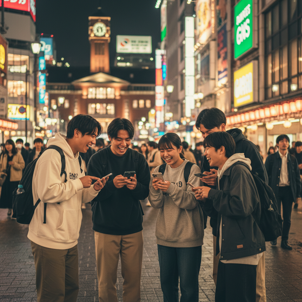 振り返ると、20代前半くらいの5人組が、誰かのスマホを覗き込みながら爆笑している。女子が3人、男子が2人。たぶん大学生か、社会人1年目くらいだろうか。そのうちの一人が「まじでそれやばいって!」と叫んで、また全員が笑う。信号が青になっても、彼らはそのまま立ち止まって画面を見続けていて、私が横を通り過ぎるときも全然気づいていなかった。